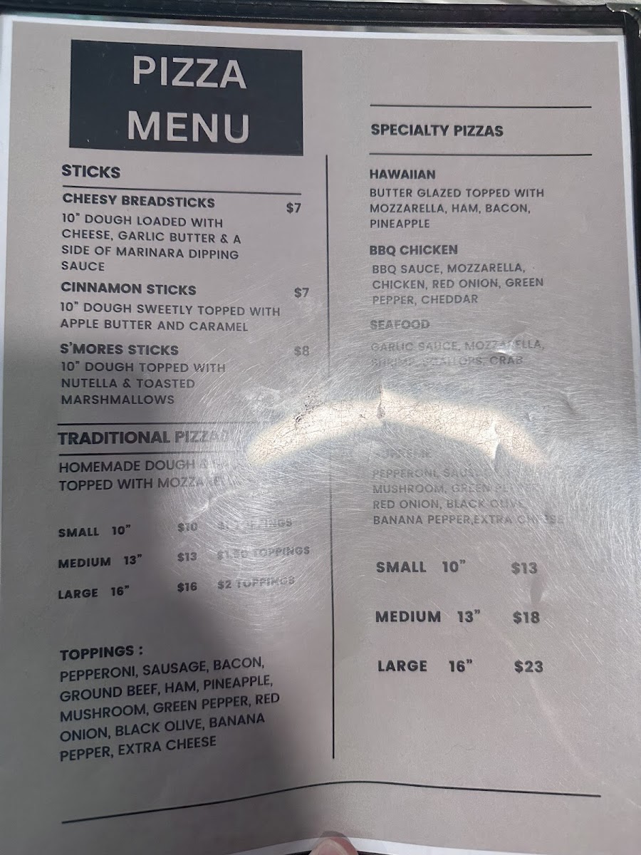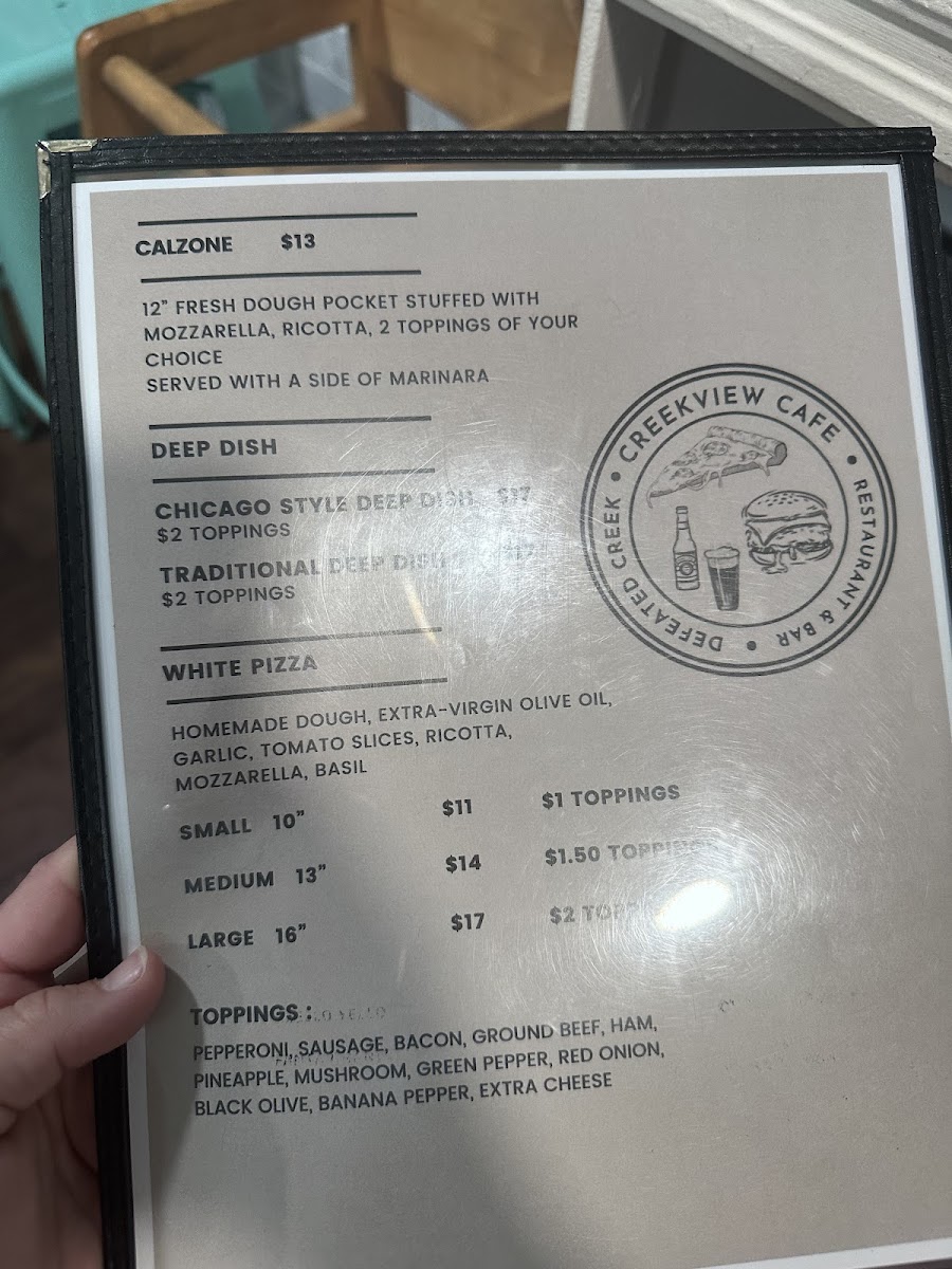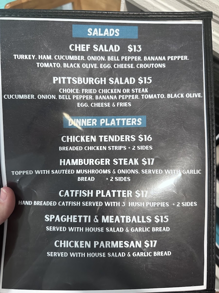From a reviewer’s perspective, the menu at Creekview Cafe offers a comforting mix of classics that highlight both variety and value. Starters like Mozzarella Sticks, Fried Pickles, Tater Bombs, Jalapeño Dip & Chips, and the generous Sampler Platter set a welcoming tone with familiar, crowd-pleasing flavors. Burger lovers can enjoy hearty options such as the Cheeseburger, Marina Burger, and Atty Melt, each paired with a satisfying side like French Fries, Onion Rings, Coleslaw, Green Beans, or Beans. Lighter choices include the Chef Salad and Pittsburgh Salad, while the dinner section brings comfort-forward plates like Chicken Tenders, Hamburger Steak, Catfish Platter, Spaghetti & Meatballs, and Chicken Parmesan. Families will appreciate the approachable Kids Menu, featuring Chick Strips, Spaghetti & Meatballs, and the Mac N Cheese Bowl. For those craving something warm and shareable, the Cheesy Breadsticks, Cinnamon Sticks, and S'mores Sticks add a fun twist. Pizza fans can choose from Hawaiian or BBQ Chicken among the Specialty Pizzas, or indulge in the hearty Chicago Style Deep Dish. Paired with simple drink selections like Sweet Tea, Unsweet Tea, Coke, Diet Coke, and Dr Pepper, the menu ultimately captures the inviting, down-home feel of a local favorite.
